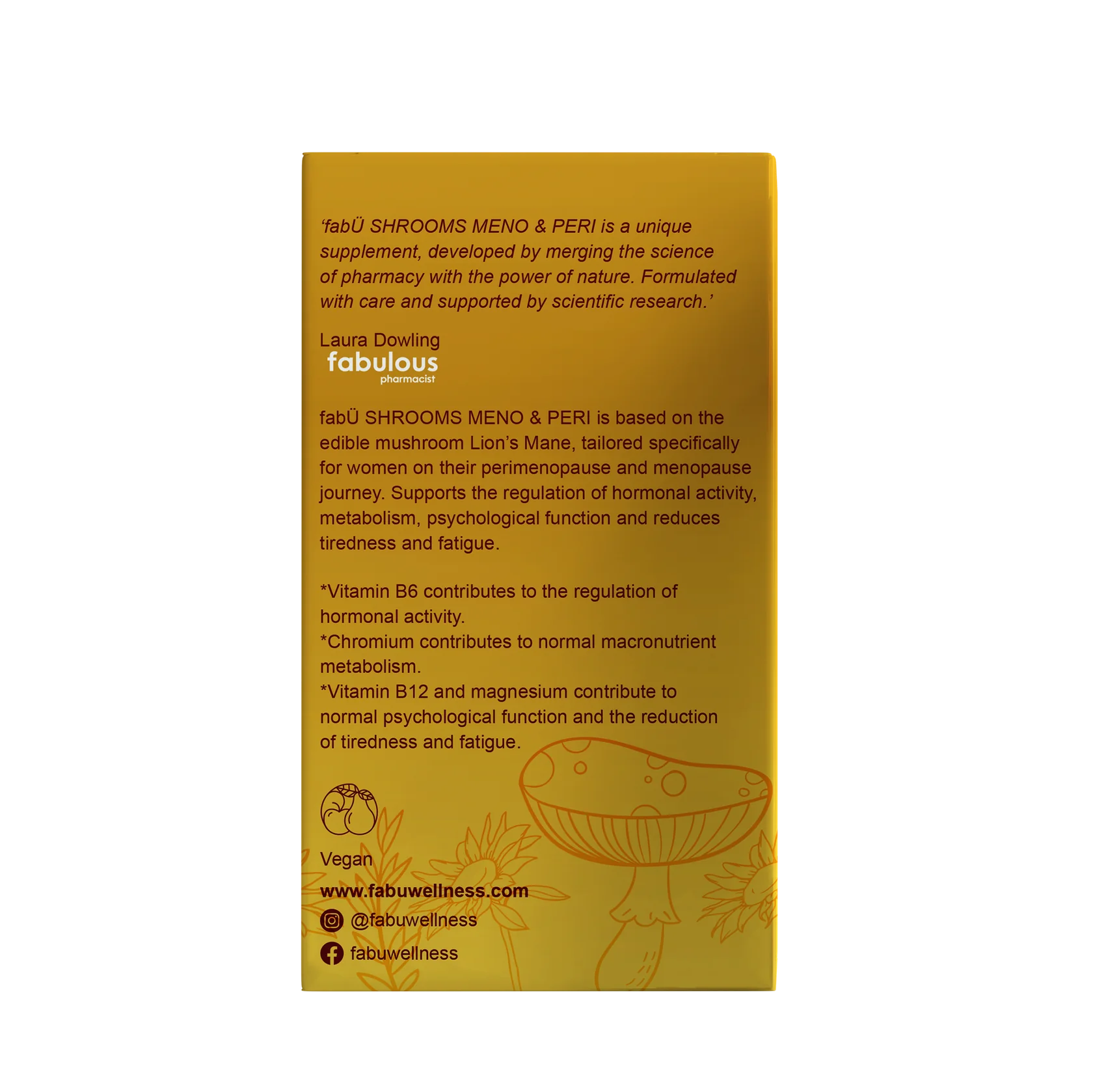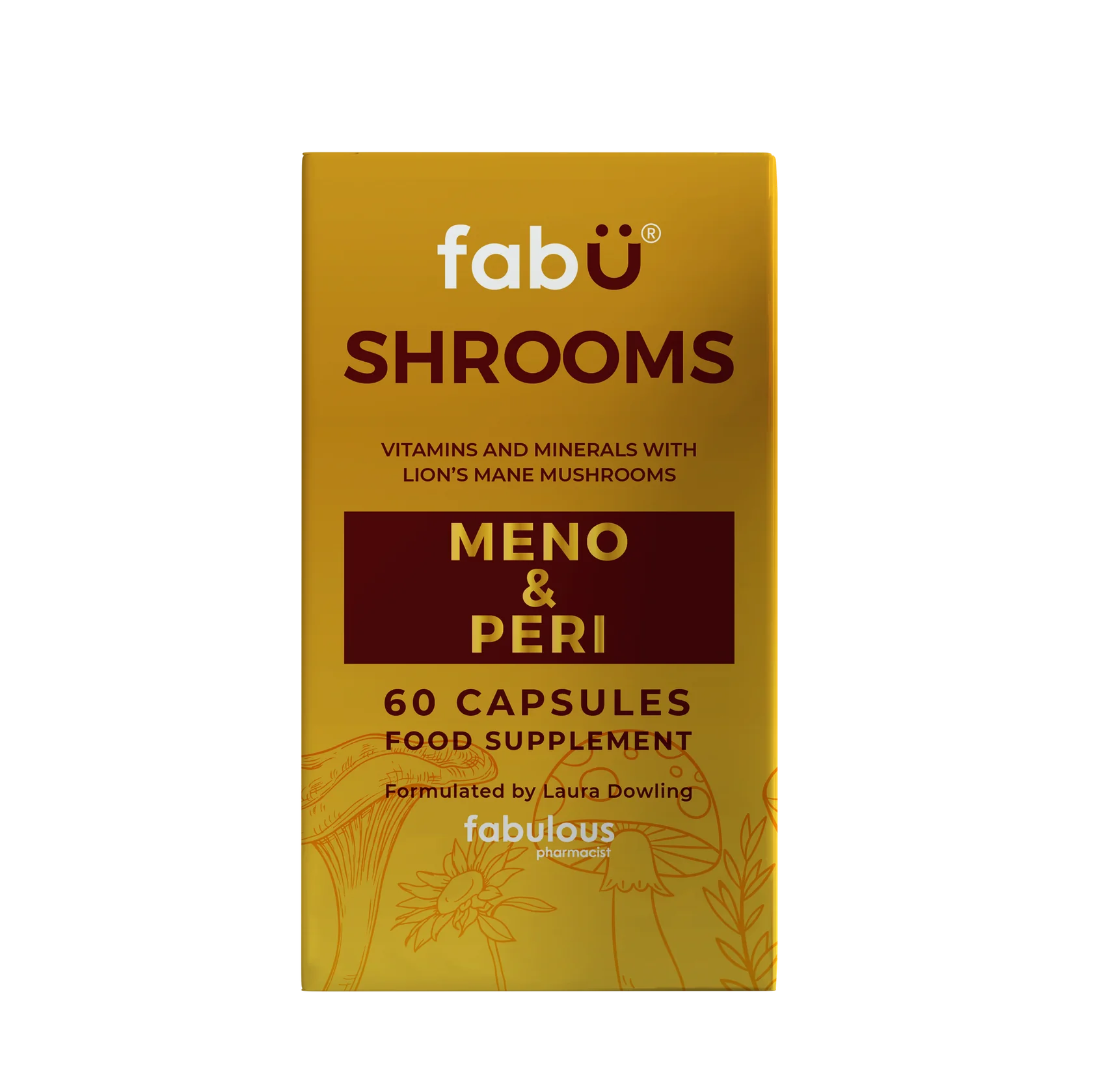 fabÜ SHROOMS MENO & PERI is unique supplement with seven active ingredients. It is based on the concentrated extract of the edible mushroom Lion's Mane, blended with Vitamin D, Vitamin K2, Vitamin B6, Vitamin B12 and Chromium tailored specifically to support a woman's journey through perimenopause and menopause.