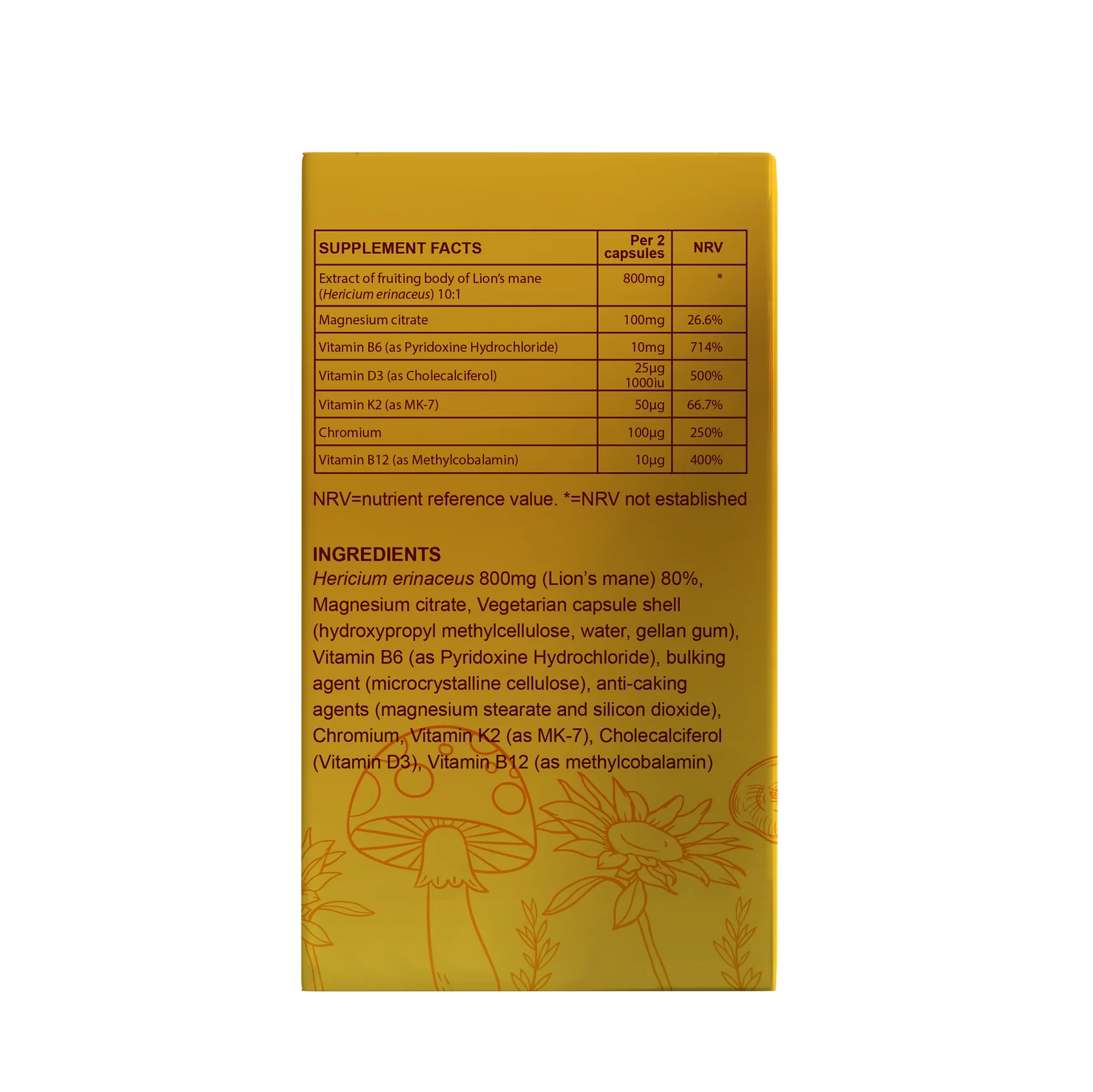 Hericium erinaceaus 800mg (Lion's mane 80%), Magnesium citrate, Pyridoxine Hydrochloride (Vitamin B6) Vegetarian capsule shell (hydroxypropyl methylcellulose, water, gellan gum), bulking agent (microcrystalline cellulose) , anti-caking agents (magnesium stearate & silicon dioxide) , Vitamin K2 (as MK-7),Cholecalciferol (Vitamin D3), methylcobalamin (Vitamin B12).